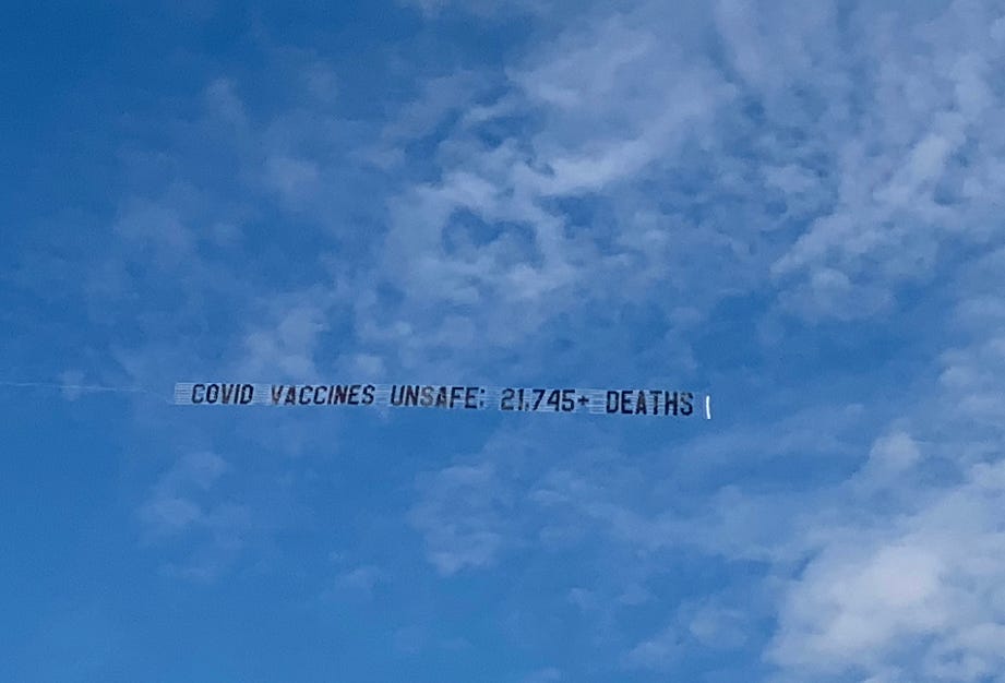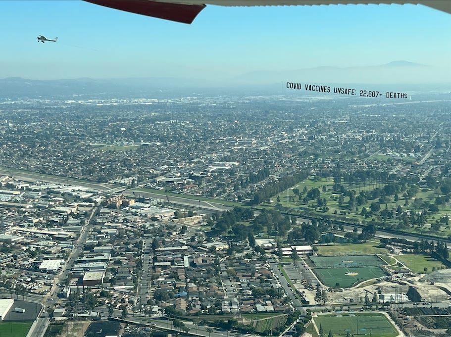 For fun, here is part of a campaign to wake people up in Los Angeles back in 2021. Does anyone recall seeing these airplane banners overhead? I hope so. Thanks to a donor, I helped booked these banner waves to spread awareness about the deaths attributed to the ConVid jabs: