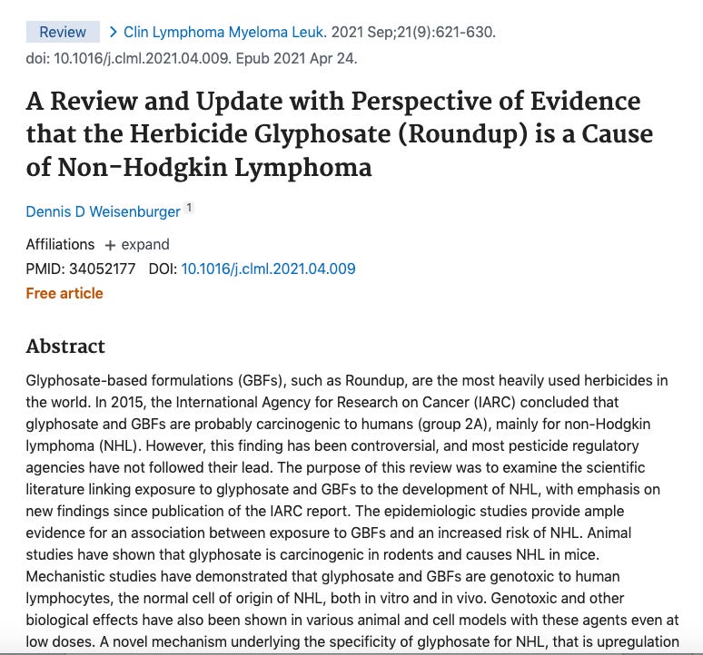 Exposure to glyphosate-based herbicides and risk for non-Hodgkin lymphoma: A meta-analysis and supporting evidence: https://www.sciencedirect.com/science/article/abs/pii/S1383574218300887