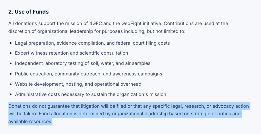 “Donations do not guarantee that litigation will be filed or that any specific legal, research, or advocacy action will be taken. Fund allocation is determined by organizational leadership based on strategic priorities and available resources.”